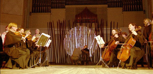 На недавнем исполнении в Зале Чайковского список новаций пополнился еще одним радикальным жестом - перформансом Франциско Инфанте-Арана , художника-концептуалиста, известного своими минималистскими "объектами" и инсталляциями. Свою акцию он назвал "Выстраивание знака". Совершалась она параллельно с музыкальным действом. Художник расположился позади группы OPUS POSTH Татьяны Гринденко и певцов ансамлбя им. Д.Покровского. Композиция строилась вживую на протяжении часа с небольшим, сколько длилась музыка. Франциско Инфанте и его ассистент Нонна Горюнова трудились неторопливо и сосредоточенно, словно медитировали с помощью черных шестов и серебристой фольги. Выраставшие прямо на глазах абстрактные пространственные фигуры напоминали то формулы-иероглифы, то реальные предметные образы, на разных этапах рождая новые ассоциации - редкие заросли камышей, затем густой, непроходимый лес. К финальному хору "Солнце красное встает" на сцене уже безмолвно царил огромный серебряный диск.