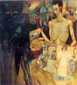 Самая монструозная на этих бегах лошадка (эдакий конек-горбунок) та, на которую поставила Третьяковская галерея . Венский художник Эрнст Фукс который год с маниакальным упорством пытается застолбиться своими опусами в наших палестинах: году в 93-м он наследил в петербургском Русском музее, лет шесть назад пометил своим присутствием эротическую выставку в московском ЦДХ. В результате часть отечественных шабашников кисти и холста, нахватавшись фуксовских образцов, потеснила на бизнес-плацдармах подземных переходов и набережных своих отсталых коллег, пробавляющихся осклизлыми копиями передвижников и салонщиков. Стиль Фукса, который сам художник называет "фантастическим реализмом", - эдакая арт-солянка, собранная из остатков первого, второго и десерта, к тому же состряпанных на разных кухнях. Для гурманов изящного, да и просто обладающих нормальным вкусом это расстройство, для кусочников искусства - пир души. В одном рассказе Станислава Лема ученый-изобретатель попросил своего приятеля испытать робота, умевшего складывать вирши, и задать ему программу, какой бы она ни была безумной. Тот предложил: пусть в стихотворении будет кибернетика, эротика, августейшие персоны, коты, негры и чтобы все слова начинались с "к". Машина поурчала и выдала: "Кот, каверзник коварный, кибэротоман, к королеве кафров крадется Киприан." Такое ощущение, что и г-на Фукса когда-то таким же образом запрограммировали с примечанием: чтобы все начиналось с "с". Иначе как объяснить, что уже полвека рука австрийца выводит кистью и резцом святых, Спасителя, сексопилок, сфинксов, сатану, серафимов, саламандр, скелеты, сомнамбул - и все со сладкой сентиментальностью садиста?