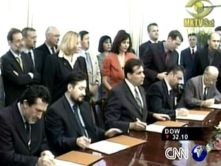 На официальной церемонии подписания присутствуют генеральный секретарь НАТО Джордж Робертсон, верховный представитель Европейского союза по вопросам внешней политики и безопасности Хавьер Солана, министры иностранных дел Бельгии и Румынии, председательствующие сейчас в Евросоюзе и ОБСЕ, Луи Мишель и Мирча Джоанэ.