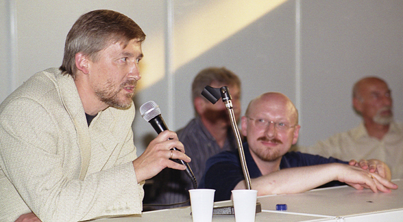 Илья Овчинников : Как вы знаете, грядет всероссийская перепись населения ; она проходит под лозунгом "Впиши свое имя в историю России". В книжке, которую мы сегодня представляем, одним из авторов справедливо сказано: непонятно, в историю чего можно вписать Русский Журнал, будь то отечественная журналистика, история русского Интернета или даже биография Павловского . Как раз в биографию Павловского РЖ неоднократно пытался вписаться - последний раз это было, когда к юбилею главного редактора мы составляли полное виртуальное собрание его сочинений, которое по разным причинам не состоялось. Было очень странно в какой-то момент обнаружить себя не кем иным, как составителем собрания сочинений Павловского. Однако эта попытка РЖ вписаться в историю пока не удалась, и сборник, который вы держите в руках, - наша следующая попытка. Составление сборника было трудной, хотя и почетной, задачей. Почетной, потому что первый наш сборник составлял Борис Кузьминский , оказаться в одном ряду с которым всегда приятно; трудной, потому что мы должны были отобрать лучшие тексты за полтора года, которые в то же время отражали бы образ журнала за пять прожитых лет в целом. Что получилось - судить читателям; составитель в моем лице - тот стрелочник, который за все в ответе. Если что-то вам там понравится, то слава Богу; если нет, то я за это отвечаю головой. Спасибо, что пришли. Надеюсь, что сборник вас порадует.