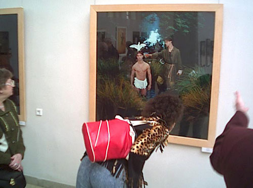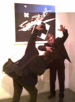 В лаконично стильном зале "Риджины", где вечно будет взывать к небесам кровь невинно убиенного в результате художественной акции поросенка, расположилась лаконично стильная композиция Орлова. Народу собралась тьма. Кто-то, как поэт-рецептуалист Слава Лен , вспоминал, что нечто подобное делал в 1997 году вместе с Михаилом Шемякиным в Америке. Кто-то, как Олег Шишкин, некогда разоблачивший Рериха в связях с НКВД, приглашал всех на премьеру дописанной им в виде пьесы "Анны Карениной-2", которая состоится 8 апреля в Питере. Кто-то просто пил желтенькое вино с пузырьками типа шампанское. Я же вникал в черный крест, круг, квадрат, которыми были прорежены фотографии с фашистскими самолетами, в пресс-релизе почему-то названные советскими. В общем, все нашли занятия по душе. Тут пришла Галя и, узнав от Володи Овчаренко, что "Риджина" в Бразилии на биеннале современного искусства выставила Сергея Браткова в качестве официального представителя России, увезла меня домой болеть.