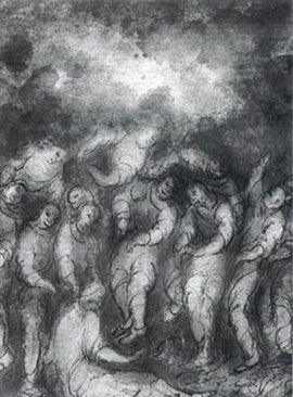 И вот тут пережитое обернулось творчеством библейской силы. Выставка на Тверской 12 называется просто: "Небо. Люди". Речь о простейших вещах, которые остаются, когда нет уже ничего. То ли дантовский ад, то ли вихри ангелов. Небо, ветер, трава - размытая тушь. Фигуры людей - как всего лишь часть ландшафта. Какая-то потусторонняя пустота, стихия в чистом виде. Какая-то девушка за моей спиной воскликнула: "Это что, Чекрыгин?" В том-то и дело, что нет. Та сакральность искусства, которую Чекрыгин в начале 20-х годов хотел достичь специально, была обретена Е.П.Левиной-Розенгольц как результат умученного пыткой человека. Как зримая аура безнадежного состояния. То, что она донесла до людей этот опыт, - невероятно.