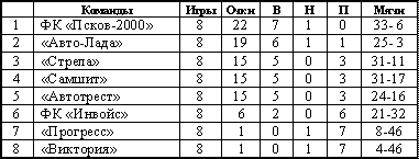 Остальные результаты 8 тура: «Стрела» - «Виктория» 8:0, ФК «Инвойс» - «Автотрест» 0:3, «Прогресс» - «Самшит» 1:4. Турнирная таблица первенства г. Пскова 2002 г. после восьмого тура выглядит следующим образом: