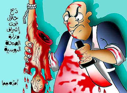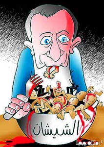Как палестинская художница, Джоха Омайя стоит целиком на чеченской стороне, о чем говорит новая и злая карикатура на президента России. Ясноглазый Владимир Путин пожирает трупы чеченцев из окровавленной миски с надписью "Аль-Чечня". Самыми жестокими в творчестве арабской художницы из палестинской газеты оказались именно антирусские карикатуры (например, русский мясник, расчленяющий мальчика для посольства России).