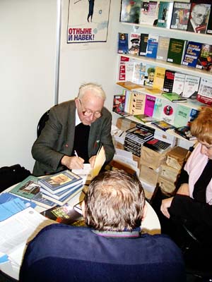 Вот Рой Медведев меня исключительно интересовал, потому что в так называемом топ-листе ярмарки была анонсирована его новая книга "Солженицын и Сталин", хотя, с другой стороны, широко известно, что Солженицын со Сталиным никогда не встречался, а Сталин понятия не имел о Солженицыне. Ракурс исследования известного историка, таким образом, можно было отнести к оригинальному. Однако выяснилось, что книга "по правде" называлась "Солженицын и Сахаров", что, согласитесь, предполагало вполне традиционный подход. Впрочем, книжку я все равно купил, а Медведева мне стало жалко - что он так покорно сидел на стульчике - и я у него поинтересовался, что он думает о Путине и нынешнем режиме. "А вот у меня еще одна книжка есть", - оживился Медведев. "Нет, нет, своими словами", - испугался я.