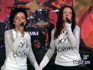 Таким образом, пишет сайт, девочки выразили свое отношение к готовящейся операции в Ираке. На самом деле, на майках Юли Волковой и Лены Катиной было написано нецензурное высказывание: "Х... войне!". "Мы уверены, что Россия нас поймет", - трогательно заявили девочки после выступления.