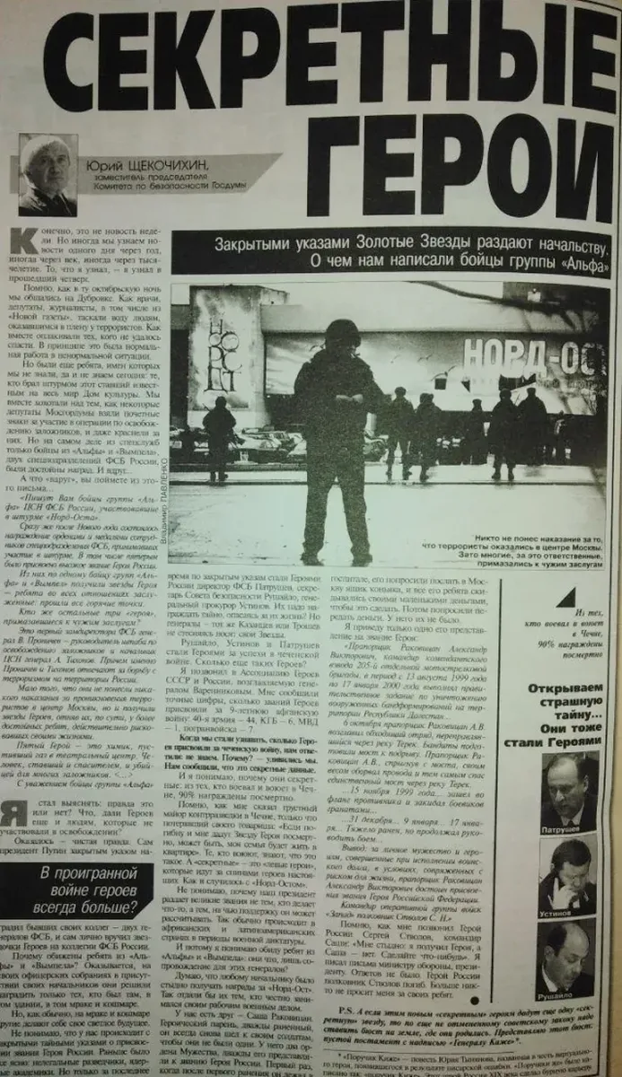 Помню, как мне сказал грустный майор контрразведки в Чечне, только что потерявший своего товарища: «Если погибну и мне дадут Звезду Героя посмертно, может быть, моя семья будет жить в квартире». Те, кто воюют, знают, что это такое. А «секретные» – это «левые герои», которые идут за спинами героев настоящих. Как и случилось с «Норд-Остом».