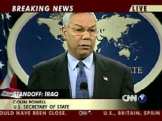 Госсекретарь США Колин Пауэлл заявил, что отказ США, Великобритании и Испании вынести на голосование в СБ ООН вторую резолюцию по Ираку вызван тем, что "есть ряд постоянных членов Совета, кто наложат вето на эту резолюцию или любую другую резолюцию".