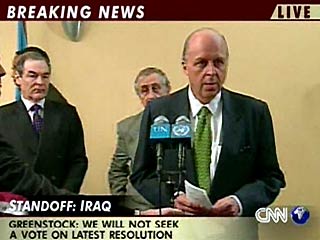 "Последние несколько дней мы провели интенсивную работу по поиску консенсуса в СБ ООН. Мы делаем вывод, что консенсус в СБ невозможен", - сказал Гринсток. При этом он отметил, что обе страны "оставляют за собой право" разоружить Ирак силой.