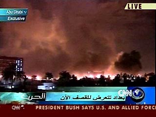 Серии мощных взрывов одна за другой потрясли Багдад. Взрывы раздавались в центре города, сильной бомбардировке подверглась резиденция Хусейна на берегу реки Тигр. Американские телеканалы показывают в прямом эфире, что город окутан огромными клубами дыма, в городе вспыхнули пожары, раздаются взрывы. Город в зареве.