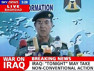 Отвечая на вопрос журналистов, применит ли Ирак оружие массового поражения против сил коалиции, министр ответил: "Нет, ничего подобного". Но он уточнил, что Ирак проведет что-то "вроде мученической операции", которая докажет всему миру провал американо-британской кампании.