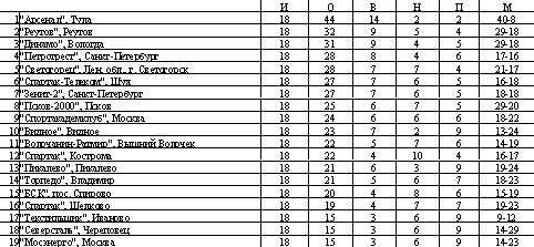 Итак, завершив матч с «Мосэнерго» вничью и пропустив последний тур из-за того, что «Уралан-Плюс», с которым псковичи должны были сыграть 20 июля, снялся с соревнований, ФК «Псков-2000» после первого круга с 25 очками занял 8-ю строчку в турнирной таблице. На 2 очка псковичи отстают от клубов «Зенит-2» и «Спартак-Телеком», идущих соответственно на 7 и 8 местах, и на 3 очка от идущих 5-м и 4-м «Светогорца» и «Петротреста».