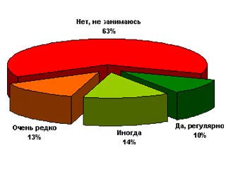 Почти две трети россиян (63 процента) - вообще не занимаются спортом, 27 процентов - иногда, и только каждый десятый опрошенный - регулярно. Об этом свидетельствуют результаты всероссийского опроса, проведенного в конце июля среди 1500 россиян компанией ROMIR Monitoring.