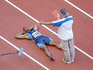 Напомним, что в одном из четвертьфинальных забегов на сто метров чемпион США Джон Драммонд совершил фальстарт. Это был второй фальстарт в забеге, и, по новым правилам ИААФ, спортсмен совершивший его дисквалифицируется с соревнований, независимо был ли он участником первого фальстарта. Однако, американский атлет категорически отказался признать себя виновным и покинуть беговую дорожку. Он улегся неподалеку от линии старта, и судьи ничего не смогли с ним поделать.
