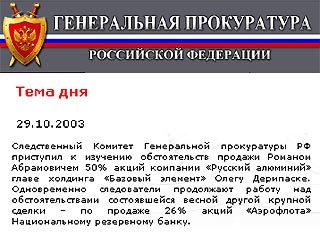 Сообщение на сайте, датированное 29 октября, хотя сейчас только начало месяца, гласит, что "Следственный Комитет Генеральной прокуратуры РФ приступил к изучению обстоятельств продажи Романом Абрамовичем 50% акций компании "Русский алюминий" главе холдинга "Базовый элемент" Олегу Дерипаске".