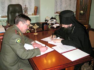 "Соглашение предусматривает совместную работу по патриотическому воспитанию и духовному окормлению военнослужащих и членов их семей, а также проведение совместных мероприятий и торжеств, посвященных памятным датам отечественной истории", - сообщает руководитель епархиального отдела по взаимодействию с правоохранительными органами и вооруженными силами о. Александр Бачурин.