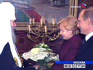 Супруга президента Людмила Путина подарила Патриарху букет цветов, и затем состоялась беседа Алексия II и Владимира Путина.