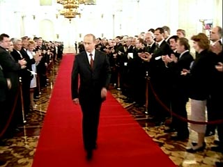 В 12 часов Путин под бой кремлевских курантов и аплодисменты собравшихся уверенной походкой прошел через три зала Кремля - Георгиевский, Александровский и Андреевский, поднялся на подиум Андреевского зала Большого Кремлевского дворца, чтобы поклясться верно служить народу во время второго срока своего президентства.