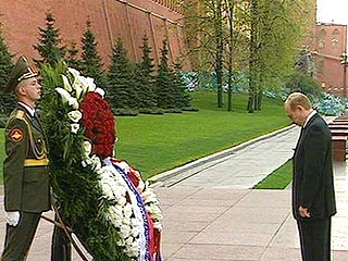 Президент России Владимир Путин в торжественной обстановке возложил в субботу утром венки к могиле Неизвестного солдата в Александровском саду в честь Дня Победы.