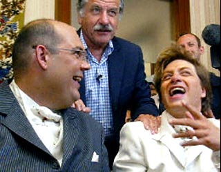 В мэрии французского города Бегля зарегистрирован первый в истории страны гомосексуальный брак. Семейными узами 34-летнего Стефана Шапана и 31-летнего Бертрана Шарпентье связал мэр города, лидер "зеленых" и экс-кандидат на последних президентских выборах во Франции Ноэль Мамер.