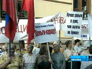 Второй пикет, расположившийся напротив здания верхней палаты, состоит из сторонников замены льгот компенсациями. Порядка 600-700 пикетчиков держат в руках лозунг "Лучше деньги в руках, чем льготы на бумаге".