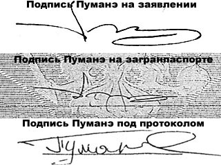 Ксения представила оригиналы рукописных текстов и подписей, сделанных Пуманэ собственноручно. И невооруженным глазом видно, что роспись Александра Пуманэ в загранпаспорте, аналогичная росписи под заявлением в телефонный узел, разительно отличается от подписи на протоколе допроса, отмечает газета.