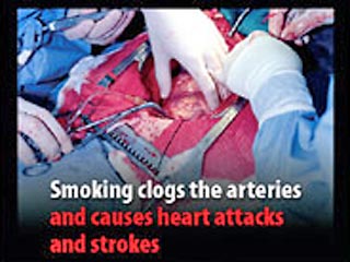 На выбор предлагаются снимки человека, больного раком горла, почерневших от никотина легких курильщика, рисунок сморщенного яблока, намекающий на преждевременное старение кожи.