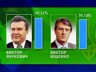 Разрыв между основными кандидатами на пост президента Украины Виктором Ющенко и Виктором Януковичем составляет уже меньше одного процента. По данным ЦИК на 14:00, которые основаны на подсчете голосов с 94,2% избирательных участков страны, за Виктора Януковича проголосовали 40,11% избирателей, а за Виктора Ющенко - 39,16%.