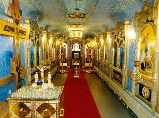 Внутри вагона – все, как в настоящей церкви: престол, иконостас, богослужебные предметы. Священник совершает здесь литургии, таинства крещения, молебны, а так же знакомит всех приходящих в передвижной храм с правилами поведения в святом месте и рассказывает о церковных обрядах.