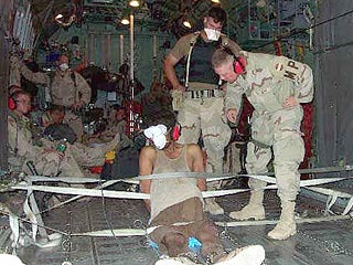 Еще на одной видеозаписи, которая будет рассмотрена отдельно, американский солдат бьет коленом заключенного по голове, а на другой американцы привязали узника к повозке, чтобы допросить его.