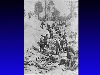 Пытаясь замести следы, НКВД делал все, чтобы места расстрелов остались неизвестным. До Медного немецкие войска не дошли. Захоронения под Харьковом не были определены как польские - там помимо пленных поляков НКВД расстрелял еще и десятки тысяч советских граждан. Однако в апреле 1943 года останки польских пленных под Катынью были обнаружены оккупационными войсками. Освидетельствовать трупы немцы пригласили экспертов из числа польских медиков, экспертов и журналистов из нейтральных стран и военнопленных армий США, Великобритании и Канады. "Тела, извлекаемые из рвов, складывались рядами на землю. Почти каждое тело, как правило, было склеено с другими трупной жижей, липкой, страшной, зловонной, не могло быть и речи о том, чтобы расстегивать карманы, не говоря уже о стягивании сапог. Специальные рабочие в присутствии делегата польского Красного Креста разрезали ножами карманы и голенища сапог, так как в них тоже находили спрятанные вещи", - писал впоследствии один из польских экспертов Юзеф Мацкевич.