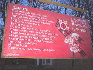 Неприятный сюрприз в канун праздников приготовил ветеранам Калининград. Ко Дню штурма Кенигсберга в городе появились 100 различных щитов и растяжек с поздравлениями, адресованными участникам войны. 15 плакатов, призванных воспеть ветеранов в стихах, напрочь испортили им настроение.