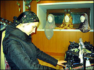 Посетителей встречают продавщицы в длинной мусульманской накидке - хиджабе, шальварах и платке. Одна из них, Халима, показывает ряды разноцветных платков и юбок, платьев, жакетов и хиджабов, демонстрирует украшения. "Все ткани современные. Очень качественные. Современная качественная фурнитура. У современных женщин и девушек-мусульманок появилась потребность в такой одежде", - рассказывает она. "Потребность открыть открыть такой магазин была давно, и мы остановили свой выбор на российской фирме "Аль-Баракат". Они пока единственные, кто шьет такую качественную женскую одежду для мусульманок, рассчитанную на неисламское государство. А мусульманские платки, которые вы видите, в основном из Европы... Италия, Франция, есть Турция", - говорит Халима.