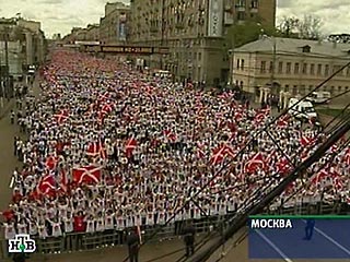 Активисты движения "Наши" вывели на столичные улицы 60 000 человек. Ради этого почти на целый день было парализовано движение автотранспорта на юге Москвы. Участники акции прошли от площади Гагарина до середины Ленинского проспекта, где принесли присягу верности Родине и приняли импровизированную эстафету у ветеранов войны.
