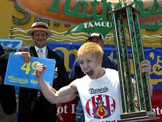 Представитель Японии Такеру Кобаяси в пятый раз подряд завоевал титул чемпиона мира на международных соревнованиях по поеданию хот-догов, которые состоялись 4 июля в Нью-Йорке. За 12 минут, отведенных участникам чемпионата, Кобаяси, известный под кличкой "Цунами", проглотил 49 булочек с сосисками, не сумев побить свой же рекорд 2004 года - 53,5 съеденных хот-дога.