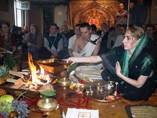 Специально для этого случая московские кришнаиты пригласили опытного астролога из Вриндавана (священный город в Индии) Бхагавата Даса, который уже много лет постигает тайны древнеиндийского искусства ваяния и живописи. Подиум для огня брахманы украсили магическими благоприятными знаками-янтрами, обещающими человеку продление жизни и духовную силу.
