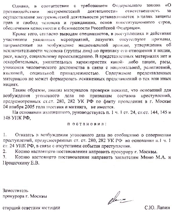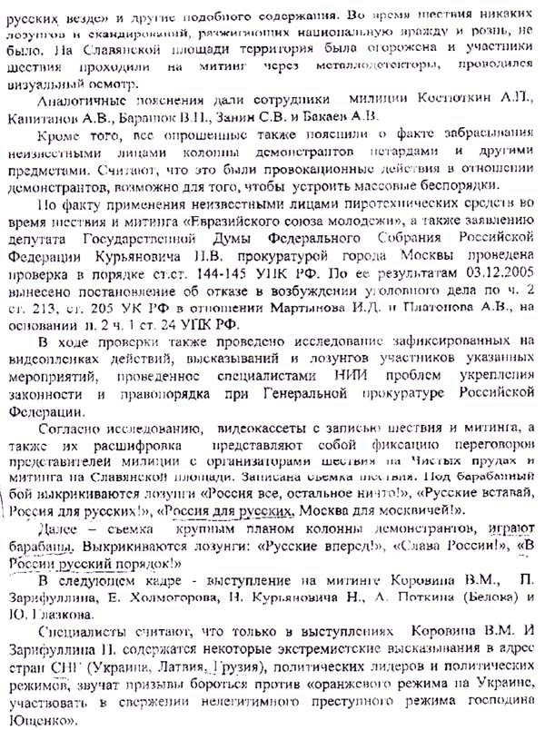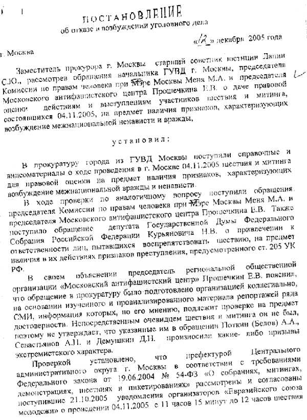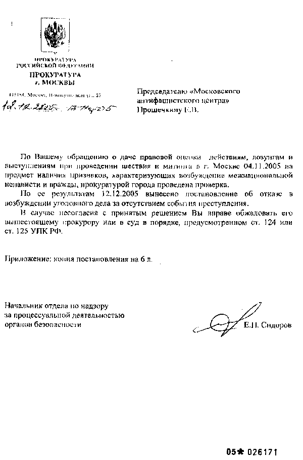 Мы публикуем текст ответа прокуратуры г.Москвы от 12 декабря 2005 г. по поводу "Правого марша", проведенного коалицией праворадикальных организаций 4 ноября 2005 г.