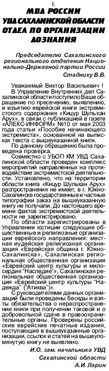 А вот и.о. заместителя начальника УВД Сахалинской области А.Ларин сообщил заявителям, что УВД области провело проверку (ту же, другую? - ред.) и тоже выяснило, что книга "Кицур Шульхан Арух" в области не печатается и не распространяется. Он также сообщил, что в еврейских организациях Сахалинской области были проведены профилактические беседы, в ходе которых предлагалось не распространять эту книгу и были "взяты обязательства о нераспространении этой книги при получении таковой и о добровольной сдаче в правоохранительные органы".