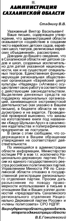 Администрация области в лице вице-губернатора, руководителя аппарата администрации В.Гомилевского ответила, что проведенная проверка показала, что "Кицур Шульхан Арух" на Сахалине не печатается (а если бы печатался? - ред.). Правда, В.Гомилевский выразил затем недоумение тем, что председатель Сахалинского регионального отделения НДПР В.Стадник выступает официально в этом качестве: ведь НДПР была в мае 2004 г. исключена из реестра партий.