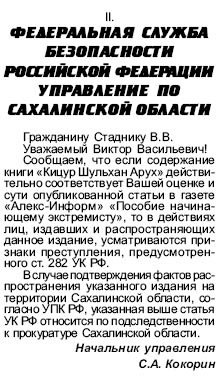 Управление ФСБ по Сахалинской области в лице начальника управления С.Кокорина ответило чисто формально: "если содержание книги "Кицур Шульхан Арух" соответствует Вашей оценке, ... то в действиях лиц, издавших и распространяющих данное издание, усматриваются признаки преступления, предусмотренного ст. 282 УК РФ", и этим делом должна заниматься прокуратура.