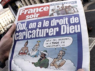 Французский таблоид France-Soir вышел в среду с заголовком на первой полосе "Да, у нас есть право пародировать Бога". Заголовок сопровождался карикатурой с изображением буддистского, иудейского, мусульманского и христианского божеств, плывущих на облаке. Внутри номера газета перепечатала датские рисунки.