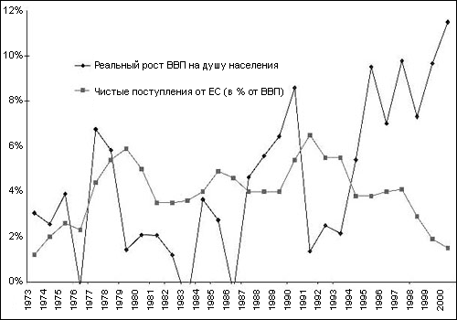 Рисунок 3. «Чистые» поступления от ЕС и темпы роста ирландской экономики, 1973–2000