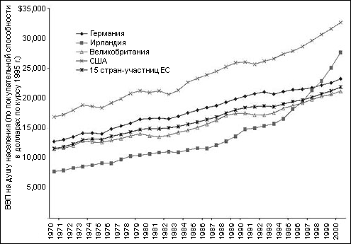 Более двух веков Ирландия была одной из беднейших стран Европы. Однако в 1990-х годах она продемонстрировала впечатляющие темпы экономического роста. К концу этого десятилетия объем ВВП на душу населения в Ирландии составил 25 000 долларов в год (по паритету покупательной способности): по этому показателю она обогнала Великобританию (22 000 долларов) и Германию (23 500 долларов) (EIU 2000: 25). А ведь еще в 1987 году объем ВВП на душу населения составлял в этой стране лишь 63% от аналогичного показателя для Великобритании (The Economist 1997). Как показано на рисунке 1, Ирландии удалось «догнать» британских соседей всего за десять с небольшим лет. С 1990 по 1995 год темпы роста ее ВВП составляли в среднем 5,14% в год, а в 1996–2000 годах они увеличились в среднем до 9,66% (International Monetary Fund 2001).