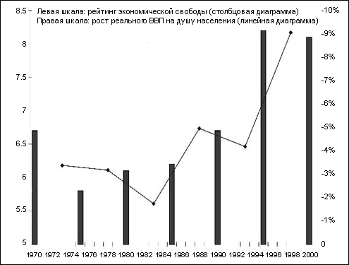 На рисунке 2 показаны средние темпы роста в Ирландии (за пятилетние периоды) и ее совокупные рейтинги с точки зрения экономической свободы за 1970–2000 годы. Из этого графика следует, что самые высокие темпы роста в Ирландии наблюдались именно в те моменты, когда резко увеличивался ее рейтинг экономической свободы.