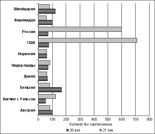 Посмотрим еще одну диаграмму, как картина выглядела в начале XIX в. и в начале ХХI в. Мы видим, что Россия была на одном из последних мест в мире по относительному количеству заключенных. Впереди нас были Швейцария, Бельгия. Иногда пишут, что у нас гораздо чаще сажают. Это не так. Если вы посмотрите судебную практику тех же западных стран, можно убедиться, что чаще сажают там, а не у нас. Но там короткие сроки наказания. Средние сроки наказания в странах Западной и Центральной Европы исчисляются в месяцах, от 2 до 8 месяцев. Средний срок наказания в западноевропейских странах больше всего в Испании — около 13 месяцев. У нас сейчас средний срок пребывания человека в тюрьме — 7 лет. Вот в чем дело.