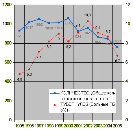 Вы можете видеть по этой диаграмме, как с 1995 г. изменялось количество заключенных и количество больных туберкулезом. Меньше заключенных — меньше туберкулеза.