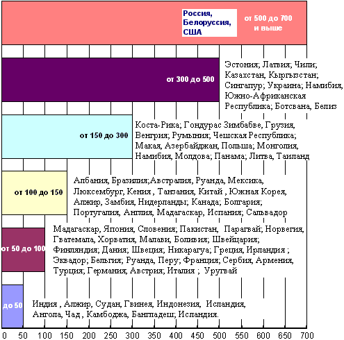 Наша страна и сейчас занимает одно из первых мест в мире по относительному количеству заключенных. Она входит в группу стран, где более 500 заключенных на 100 тысяч населения. А остальные страны распределяются в группах меньше 50, до 100 на 100 тыс. В подавляющем большинстве стран количество заключенных не превышает 150. Только в каких-то удивительных странах, таких как США, Россия, Белоруссия, Казахстан (недавно Казахстан был в этой группе), заключенных более 500.