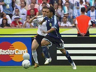 С первых минут пошла жесткая напряженная борьба на каждом участке поля, но соперники создали немного опасных моментов. Сборная Аргентины открыла счет в начале второго тайма: защитник Роберто Айала ударом головой поразил ворота Йенса Леманна, выпрыгнув выше всех после подачи углового с правого фланга в исполнении Хуана Рикельме.