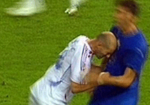 Во втором дополнительном тайме (110-я минута) Матерацци спровоцировал Зидана на грубое нарушение правил. Он придержал француза руками, а потом что-то сказал ему. Зидан с разбегу ударил его головой в грудь, за что заработал красную карточку.