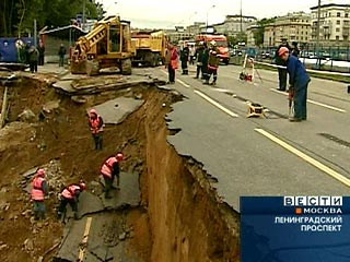 Около 22:00 воскресенья из-за повреждения трубы "Мосводоканала", в районе дома N39 по Ленинградскому проспекту, что между станциями метро "Динамо" и "Аэропорт", образовалась промоина размером 16 на 30 метров и глубиной до десяти метров. В нее провалился грузовик "КамАЗ" и сварочный компрессор, припаркованные на дублере Ленинградского проспекта. При этом никто не пострадал.